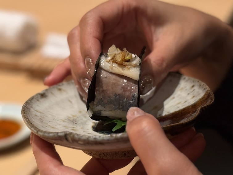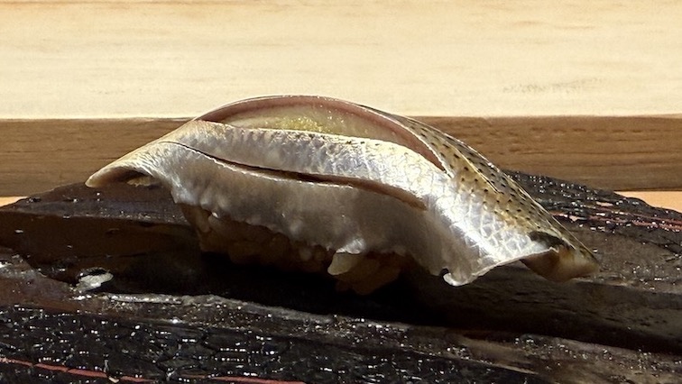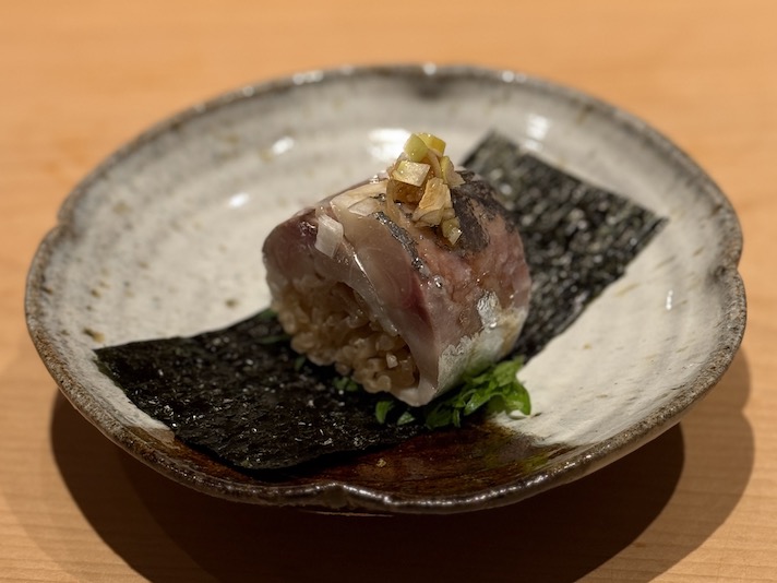 天草の子鯵を酢締めにして、棒すしのような海苔巻きにて。