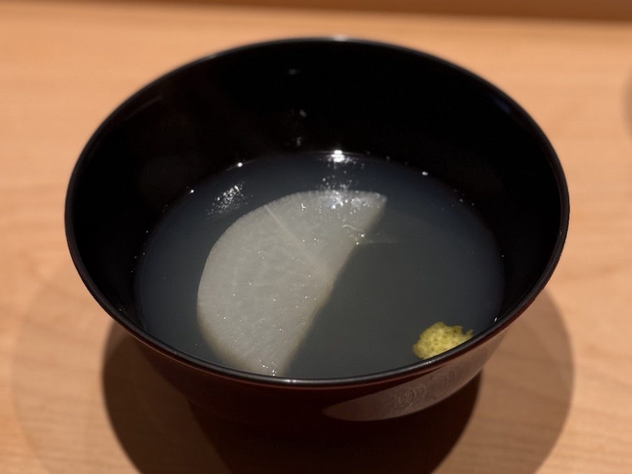 この一品を味わって感じたのは、お椀ってどうしても和の華。そこで主役級のお魚や肉をどうしても入れがちですが、シンプルに味わうなら大根とか野菜を主役に据えるのが良いなぁと。長岡さんの感性、間違いなく鮨の域を超えてるな✨