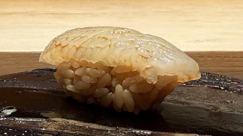 続いては天草の泥障烏賊、丁寧に包丁が入れあるので口当たりが柔らか。噛むほどのにイカとシャリが合わさって乳化するのよ〜幸せだなぁ。