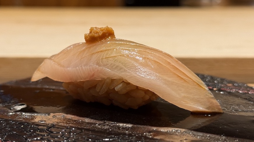 続いても天草から縞鯵、上に乗せているのは山ワサビの醤油漬けとのこと。縞鯵の身の美しさをみるだけで、これがどんなに美味しいか伝わると良いのになぁ🤗
