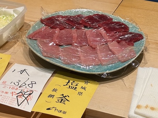 能登半島の内海に漁場を有している日の出大敷、そちらの定置網で取れた10キロのメジマグロとのこと。こういう説明ってグルメパートナー好きだろうなと隣を見ると、目を輝かせながらメジマグロを見てました🤩