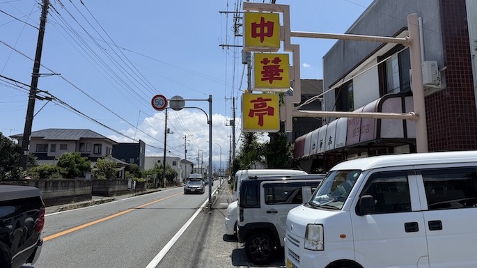 こちらが国道136号線沿いに出ている中華亭さんの看板。レトロな雰囲気がちょっと怪しさを感じさせるのですが、この通り店頭は常に満車です!