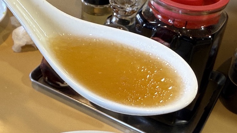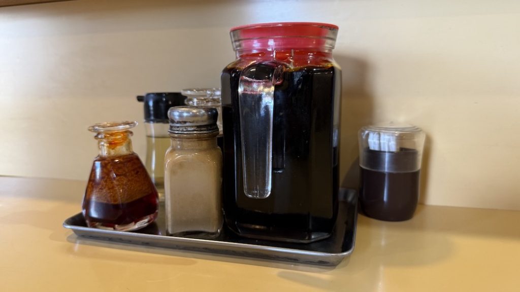 卓上調味料は、どか〜んと存在感のある餃子のタレ・醤油・酢・胡椒・辣油のラインナップ。餃子のタレを見れば、このお店の餃子がいかに人気かすぐにわかりますよね(笑)