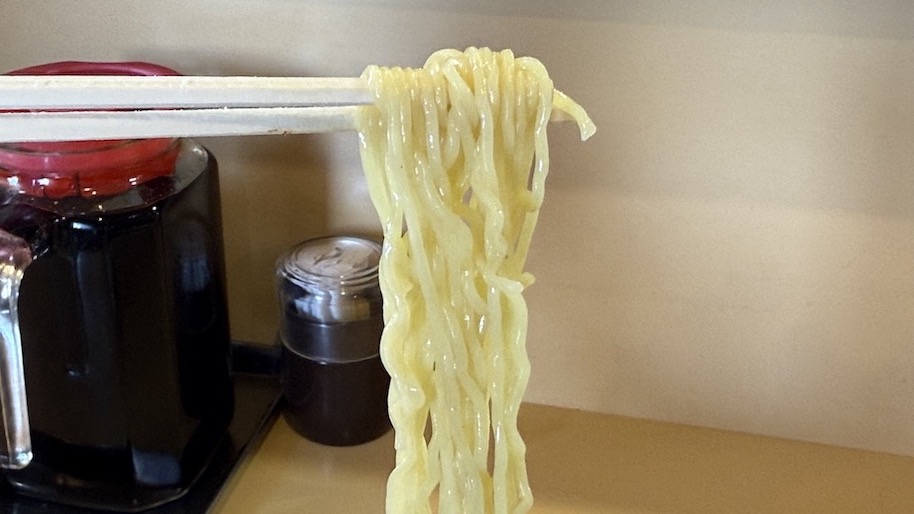 ノーマルの麺はやや細め、わずかに縮れることでスープの持ち上げが👍 食べ進めると気がつきますが、あれれ麺の量が結構多めですよ。