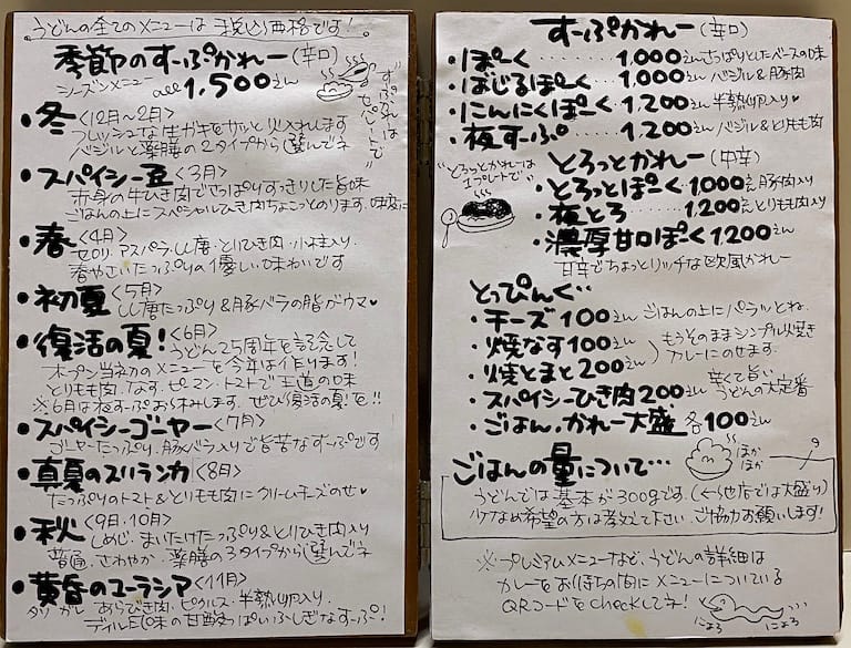 左ページには季節ごとに変わる季節のすーぷかれー。ちなみにこちらに記載されているのはノーマルメニューで、うどんさんのアメブロにはワンランク上のプレミアムメニューが紹介されています。