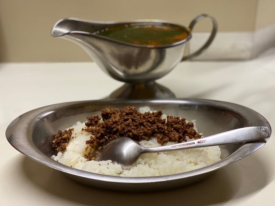 ここ数年、盛り付けが美しいスパイスカレーが流行っていますが、その対局をいく潔い良いほどのシンプルなカレー。銀皿が眩しいほどに渋過ぎる👏