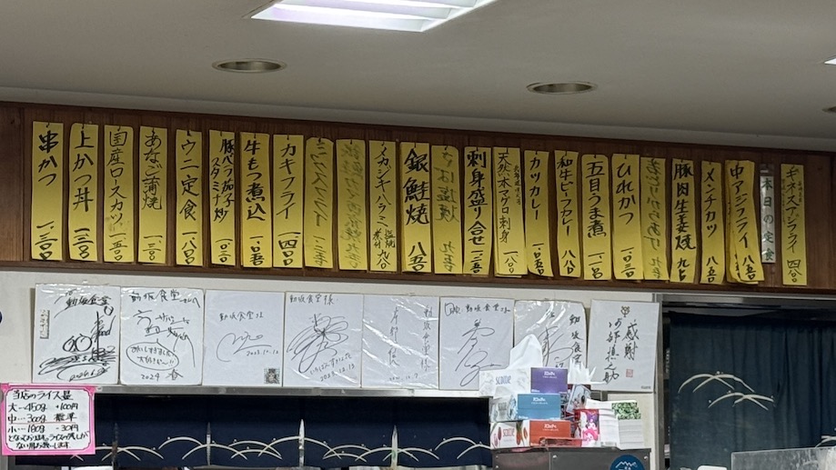 定食メニューは厨房上のこちらのゾーンに。げ、げ、げ、お目当てのミックスフライがひっくり返ってるじゃん😭