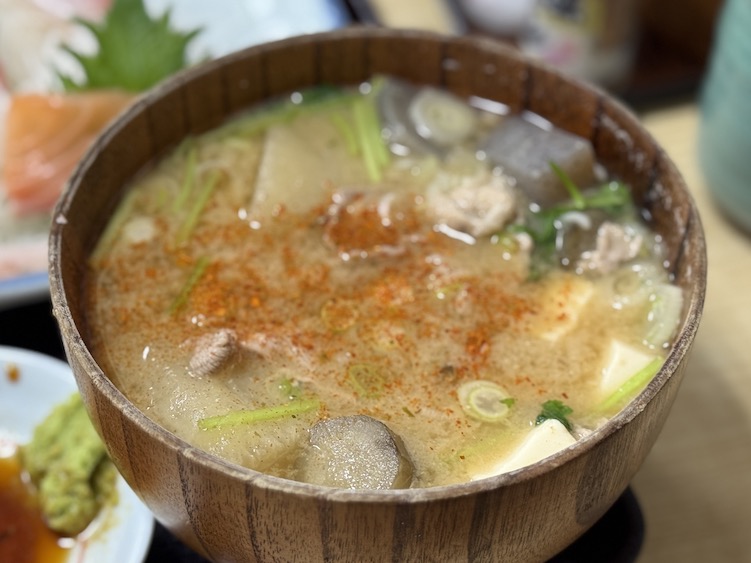 すでに気が付いている人もいたと思いますが、お刺身ってこの価格では美味しいものは難しいですよね。そんな時に備えて、味噌汁をとん汁に変更しておきました🙌