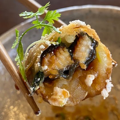 一品目はうなぎと16ヶ月間熟成させたジャガイモを包んで揚げた一品
