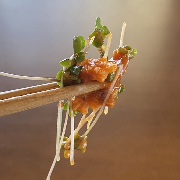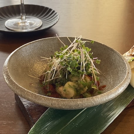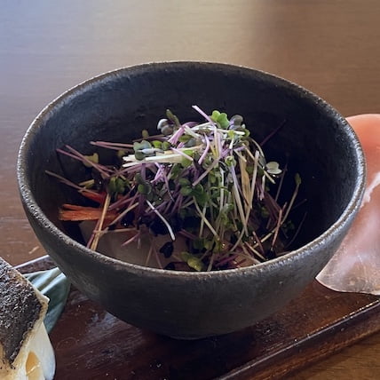 もぺが思うところのフレンチドレッシングを爽やかにしたお味、薬味をたっぷりと乗せて頂くと海鮮との相性が