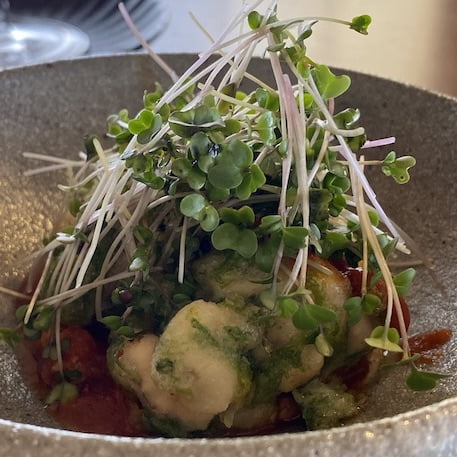 フワフワの白子にやっぱり浜名湖産の青海苔の風味、さらにトマトベースのビスクがソースなんて