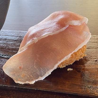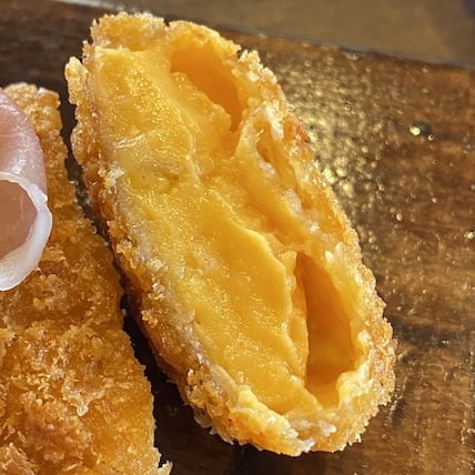 どんなコロッケかなぁと半分にしてみると、濃厚な雲丹クリームの塊やん! 以外にもコロッケの塩気は最小に抑えてあるので物足りないのですが、生ハムと一緒に頂くとはっきりとした塩味の強弱が面白く