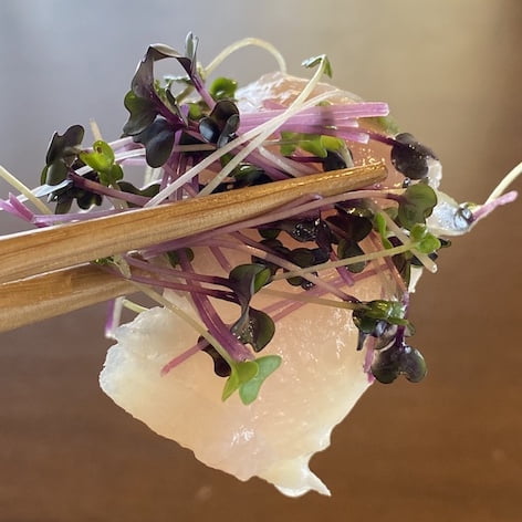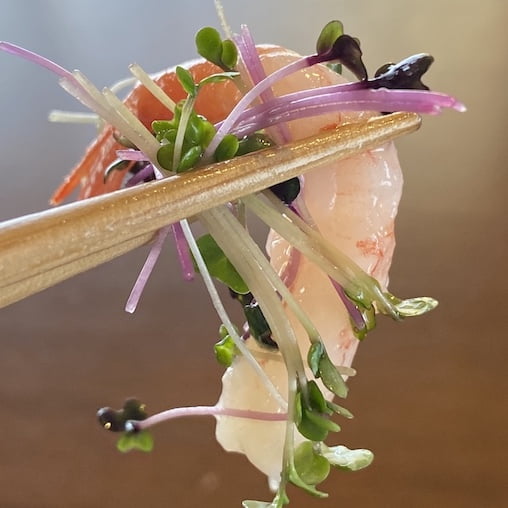 薬味がてんこ盛りで全く何かわからないこちらは、沖縄県の袖イカ、甘海老、マグロのカルパッチョ