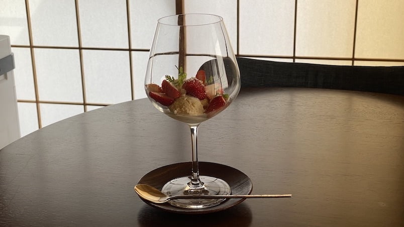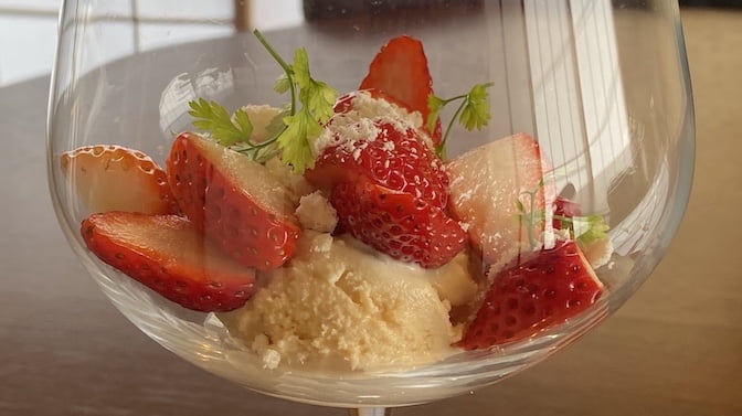 この日の最後の締めとなるデザートは焦がしバターと藤枝の飛鳥山味醂(ミリン)とアーモンドを使ったアイス。そこにイチゴとオリーブオイルの粉末を添えて🍓