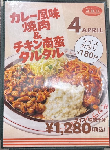 なんか月替わりぽいメニューもありまして、4月はカレー風味焼肉とチキン南蛮タルタルです。