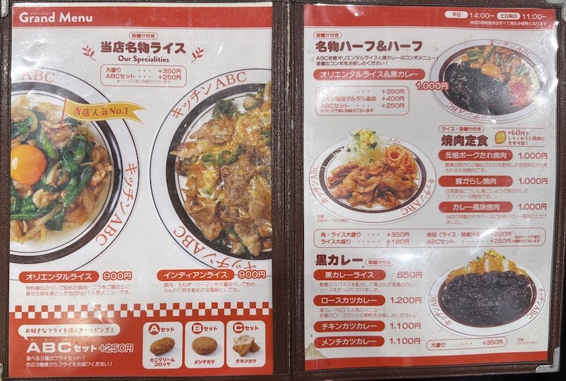 キッチンABCさんのメニューですが、食べたことのないオリジナルメニューがてんこ盛りよ。オリエンタルライスにインディアンライス、どんな味がするのか未知の世界だわ。