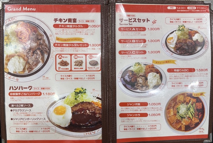 定番のチキン南蛮にハンバーグ、色々な味が楽しめるサービスセット。中でも、もぺが一番気になったのは、右下にあるジャンボ焼&ジャンカラなる聞いたことのメニューたち。