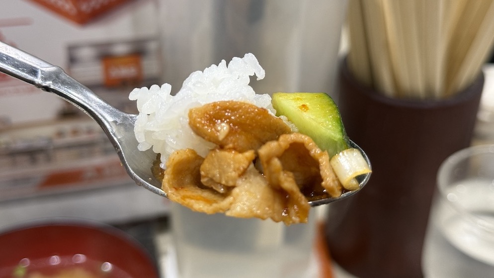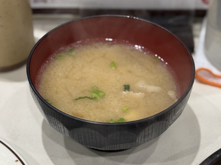 野菜が多めに入っており、味噌汁だと思っていたので豚汁は嬉しい誤算。意外にも味わいは薄めで優しいっす。