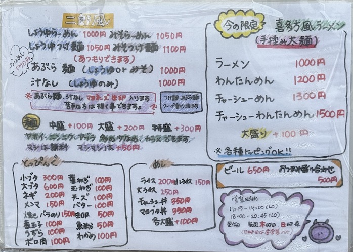 ちなみに定番のメニューのほかに限定麺も展開されていて、この時は右上にある喜多方風が限定扱いとなってました。実はこれ、限定の中では定番の商品のようで、やっとこさ食べる機会に恵まれたぞ🙌