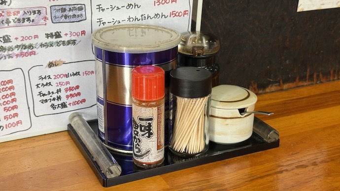 卓上調味料は、一味唐辛子・胡椒・豆板醤・醤油になっております。