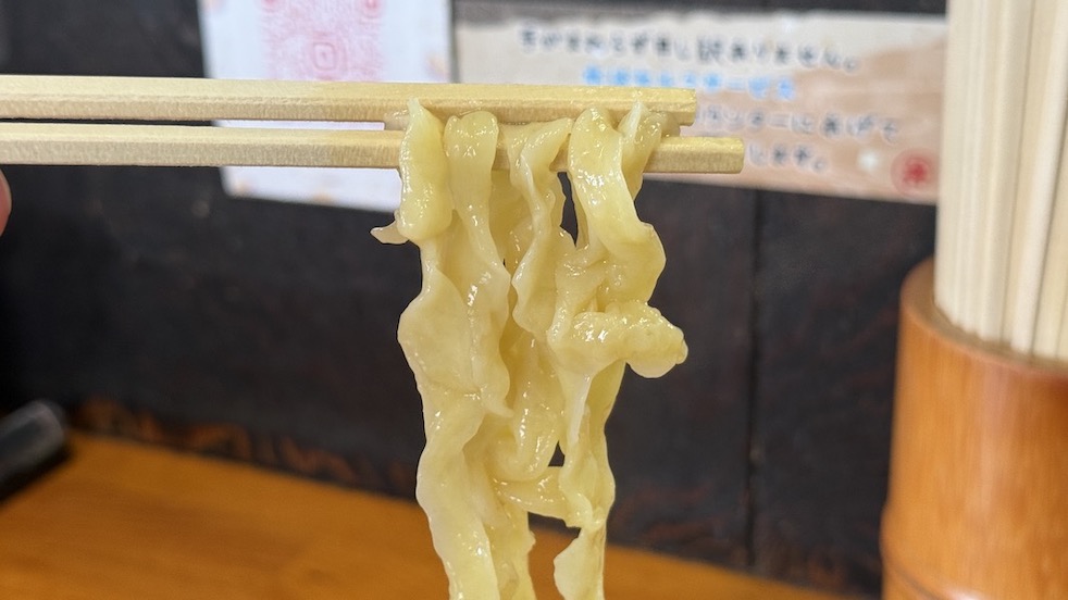麺は手揉みの太麺と書かれていましたが、これが1センチを超えるほどの太麺でびっくり。一本で食べても、しっかりと縮れたプリプリ感が楽しくて