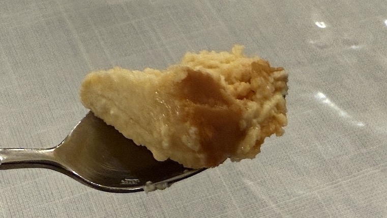 スプーンで取り分けるとわかりますが、ホロホロとしたちょっとドライぽいチーズケーキ? ただこれ、適度に水分もあり不思議な食感と味わい。