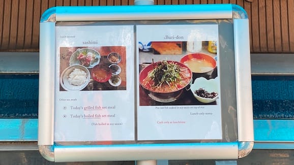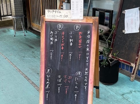 その日のメニューは店頭にある黒板にて告知するスタイル。種類は限定されていますが、お刺身から焼き魚に煮魚と、一通りのお魚定食がラインナップされています。