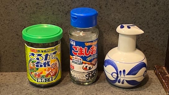 卓上調味料は醤油・ごましお・さるかに合戦の海苔ごま。