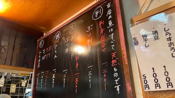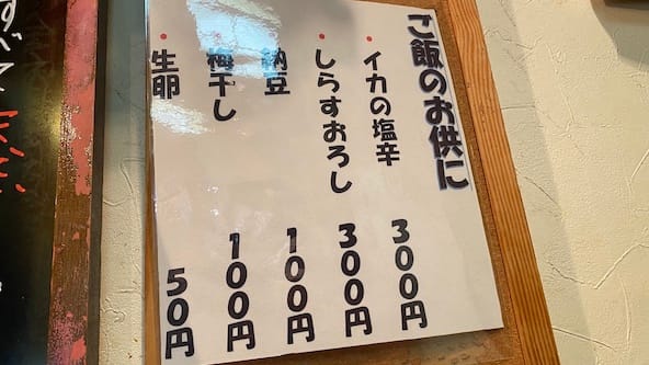 メニューは先ほどの看板と同じ。お話を聞いていると、刺身盛り合わせは、その時々によって内容が同じ日でも変わる様子。