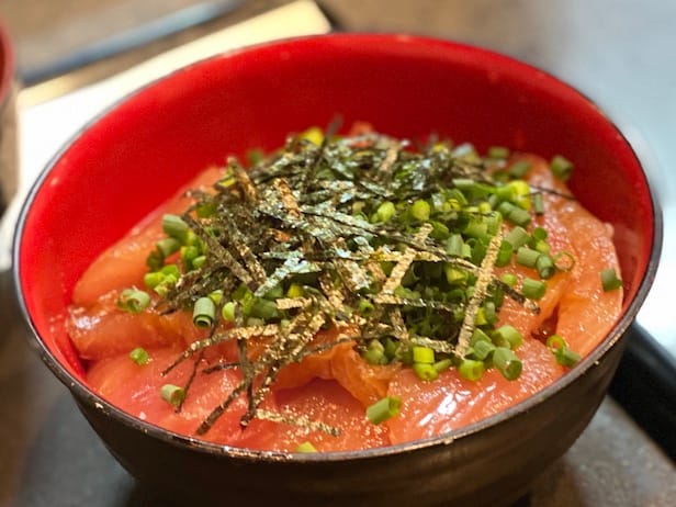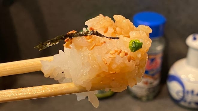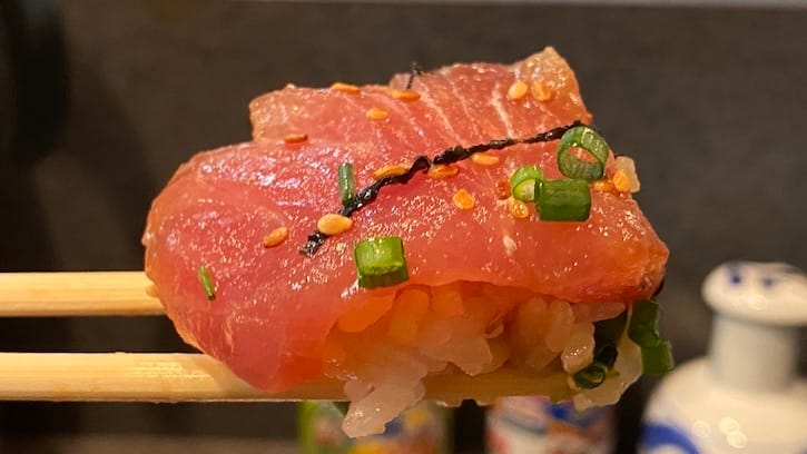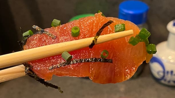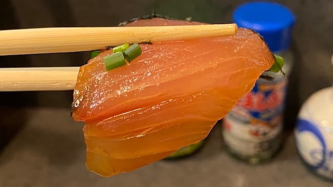 こちらはブリの腹身っぽい部位。程よく脂が乗っているため、漬け汁の染み込みがほどほど。う〜ん、さりげなく乗っているこの海苔とネギがまた良い仕事して