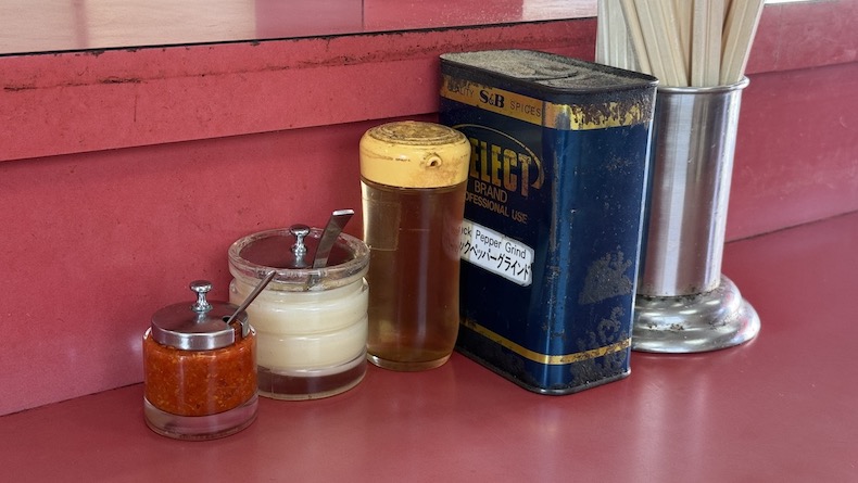 卓上調味料は、左手から辛味・ニンニク・酢・最後に年季の入った黒胡椒の缶。この缶は捨てることなく、中身を入れ替えて使い続けてるんだろうな🙄