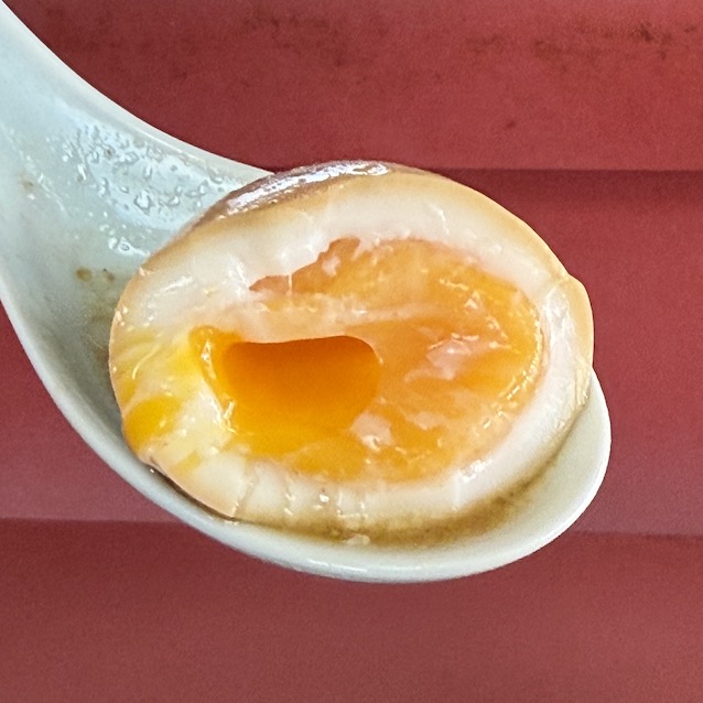 最後のお楽しみは味玉さん。これはM~Lの微妙なサイズですが、明らかにMよりは大きい気がします。味付けもほどほど、黄身はトロッと仕上がっていたので、これはライスと合わせても美味しいやつだね!