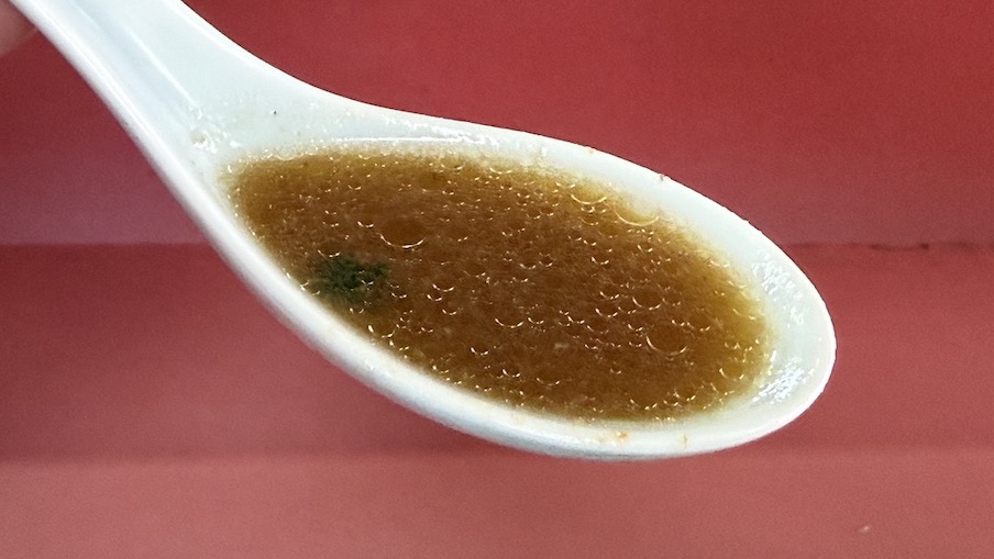 まずはスープから味わってみると、ありゃりゃ? 油分は比較的強めに効いていますが、スープの豚骨感は抑え目で、塩気もそんなになくて穏やかな味わい。