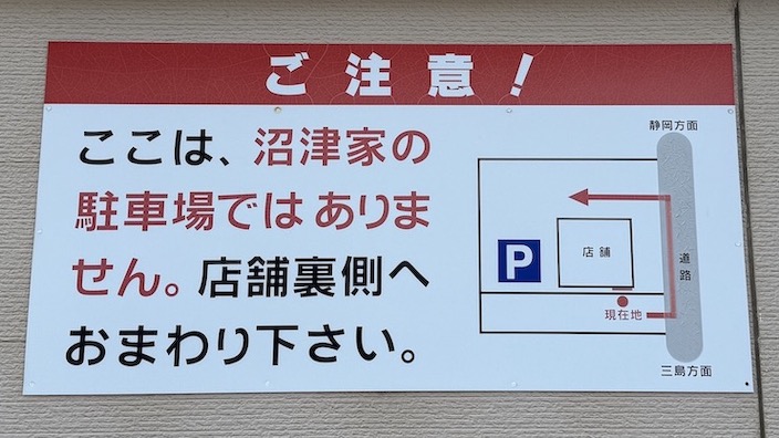 沼津家さんは店舗の両側が駐車場になっているので、駐車場の間違いにご注意ください。沼津家さんの駐車場は、沼津側から入る店舗裏手の駐車場になります。