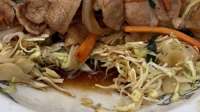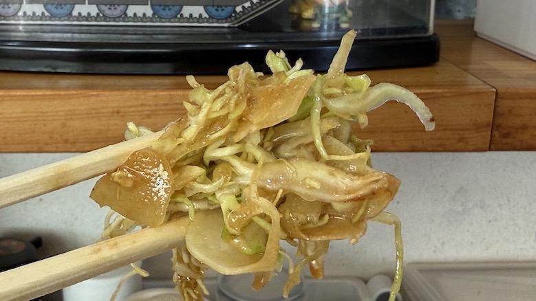 ちなみに、豚肉の下にはキャベツの千切りがたっぷり。ということは、キャベツをタレでしみしみにして食べると