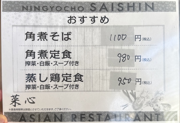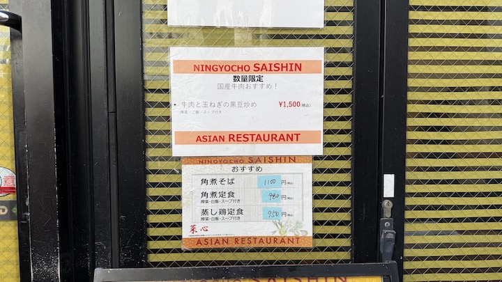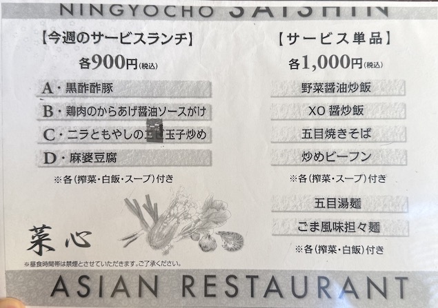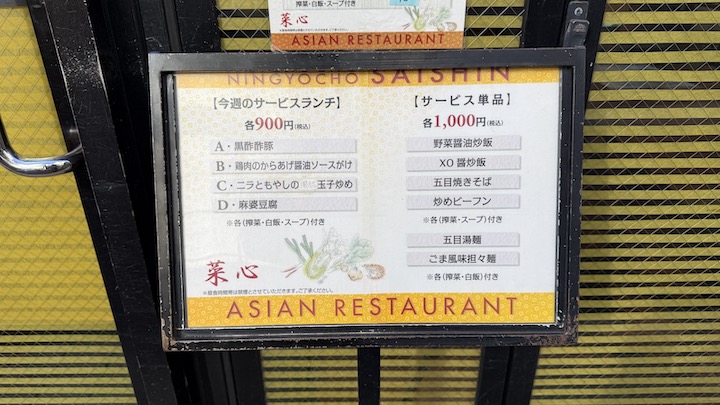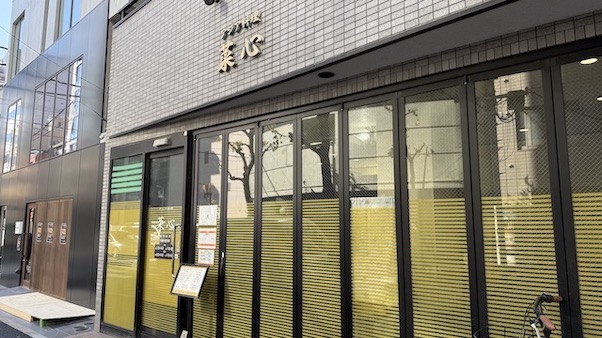 人形町のとある細い通り沿い、特に派手な電飾があるわけでもない落ち着いた店舗の菜心さん。ガラスには目隠しが入っているため、中の様子がぜんぜんわかりません💦