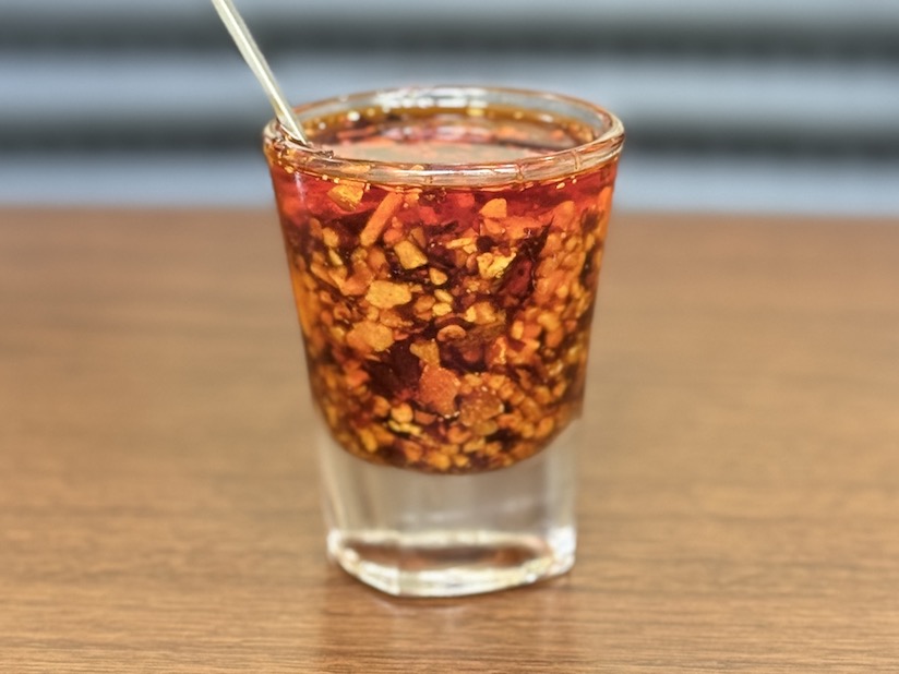 注文を終えると、真っ先に登場したのが食べるラー油の小さなグラス🔥 お〜お、油は上まで入っていますが、よく見ると固形物が9割くらい占めており、これはまさに食べるラー油さまですよ!