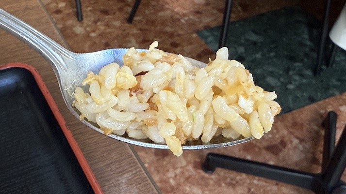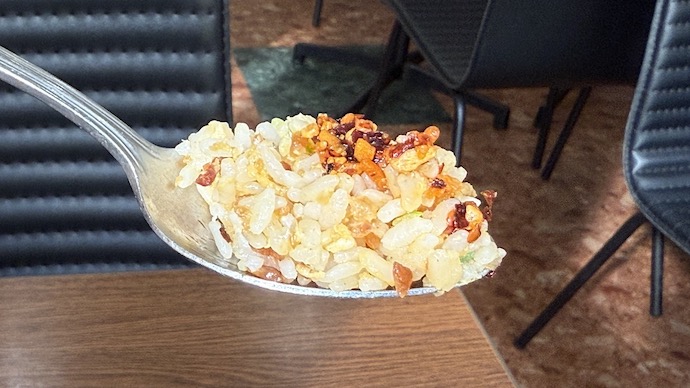 さっそくマウンテンにスプーンを入れてみると、パラパラなので山が崩れるほど。一口食べてみると、XO醬の表現し難いが味わい深くて