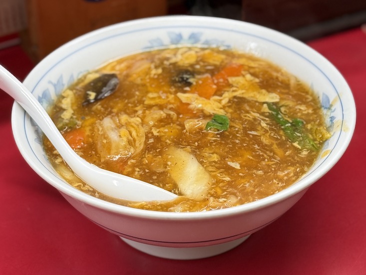 同店が65年の長きにわたりその味を守り続けてきたという、名物「ターローメン」は酸味と辛みとニンニクの香りがクセになる、餡かけラーメンです。ラーメンの上に餡がかかっていると思ったら大間違い。スープがすべて餡そのものなのです。そのトロトロの餡は麺によく絡み、モチモチの麺とともに最後の一滴まで飲み干せてしまう美味しさです。