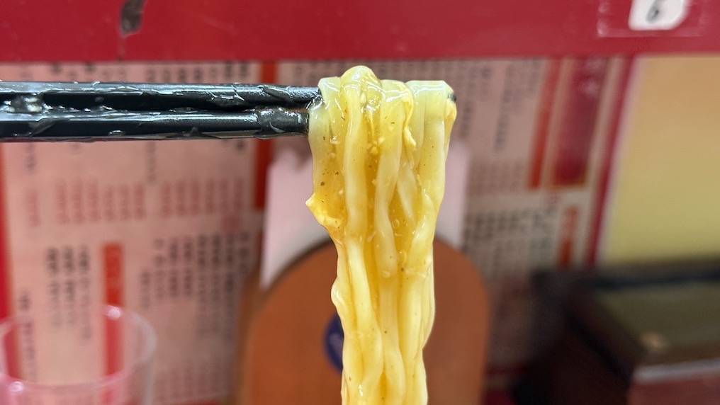 このターローメンの面白いところは、なんと麺がやや平打ちになっています。ここにあんかけがほっといても程よく絡み、この麺の太さとあんかけの粘度が絶妙で