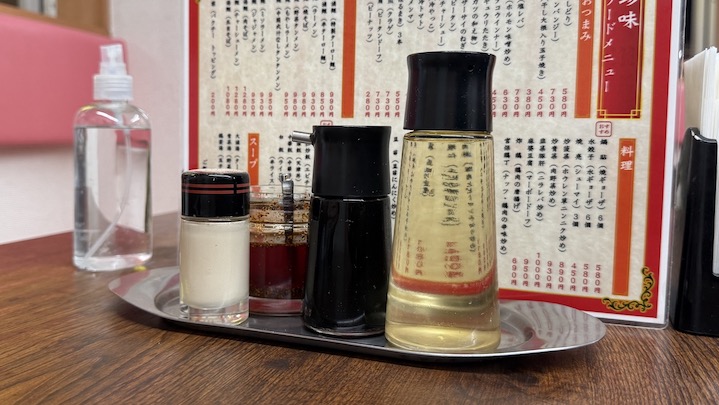 卓上調味料は、酢・醤油・辣油・胡椒の定番ラインナップ。
