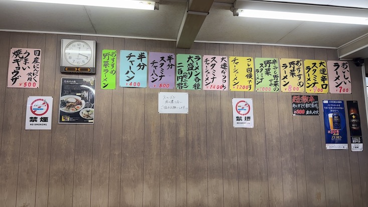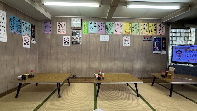 メニューはお座敷の壁にカラフルに貼ってありますね。