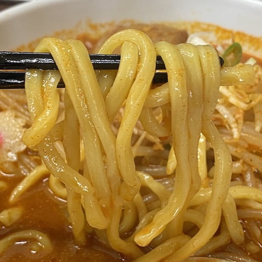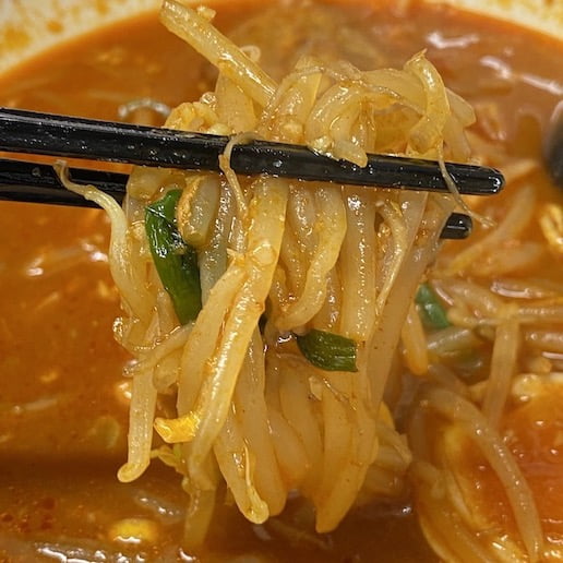 顔を近づけて麺をすすっていると、赤いスープで顔を洗おうとしている感じで面白かった🤣。