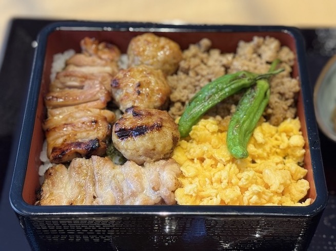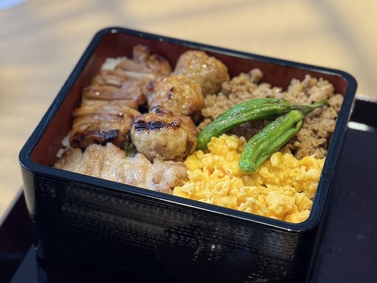焼き鳥重をぱっかーんとしてみると、玉子・鶏そぼろ・ししとう・つくね・焼き鳥が2本分。玉子とししとうが入ることで、彩りが美しくて良い感じだね。