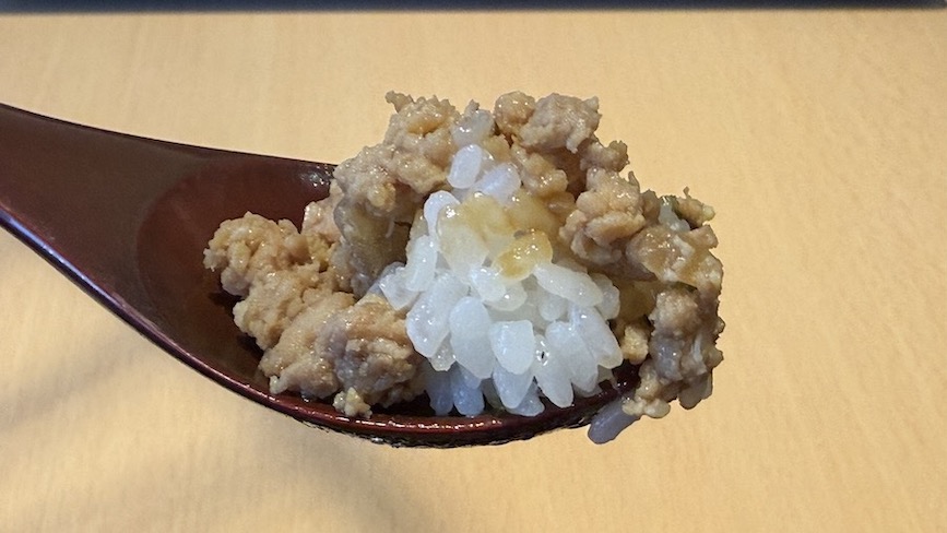 鶏そぼろは粗挽き、やや甘めの味付けによりご飯が進くん。お米もしっかりとしており、定食屋とは異なりちゃんと申し分なく美味しゅうございます(笑)