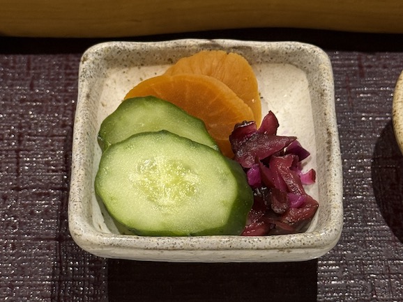 お漬物は丁寧に盛り付けられた三種。最近しみじみと感じるのは、お漬物って定食には当たり前のように付いてくるけど、これってありがたいことだなぁと。