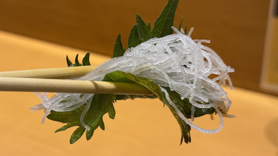 最後はお刺身の下にあるツマをサラダ代わり、お刺身が新鮮だとツマにドリップが落ちないので綺麗よね。